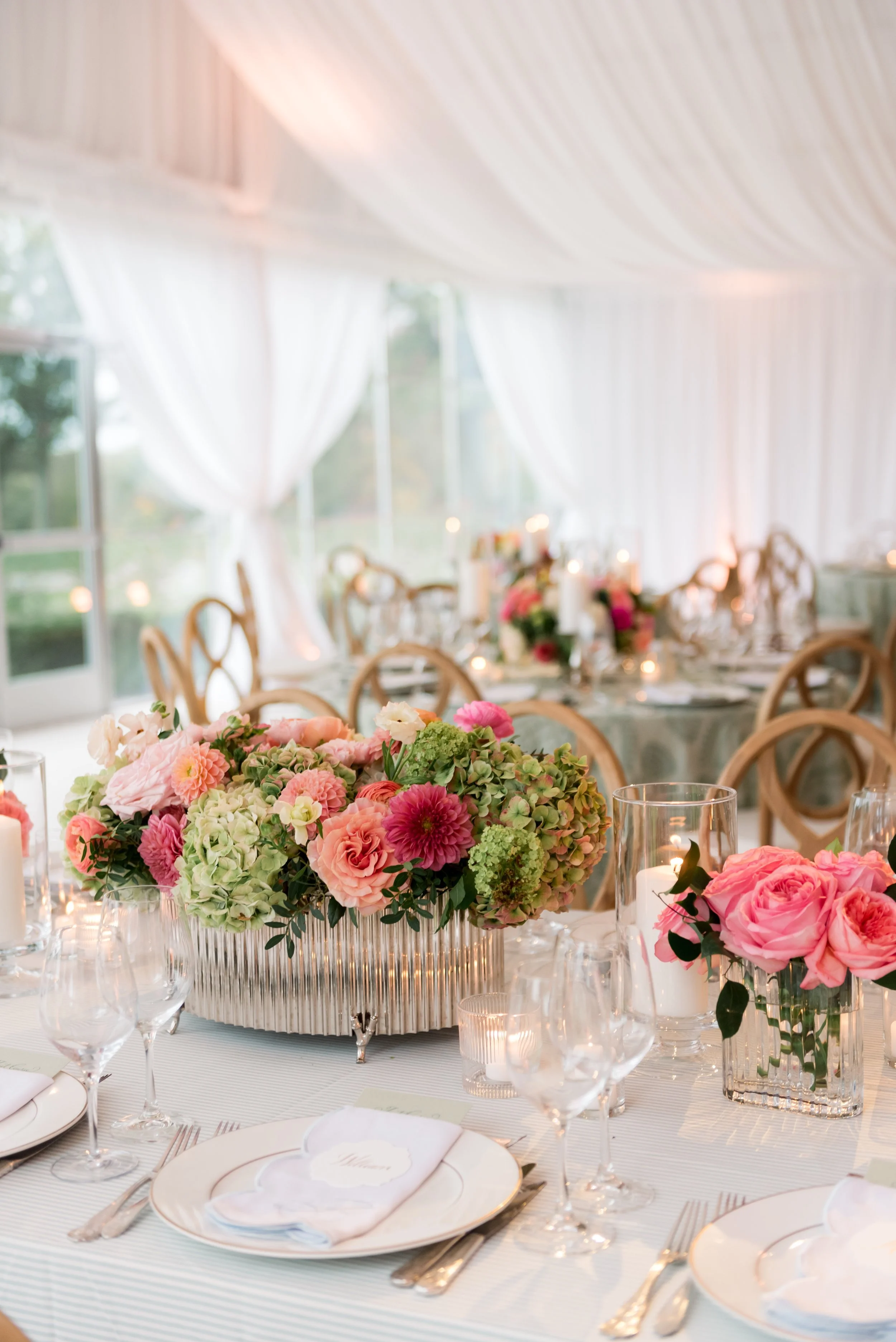 We went green for this midwestern wedding for one of our favorite planner brides. We created a total transformation of a country club lawn with a fully draped tent structure and greenery on every suspended element. Favorite moments will always be the custom painted striped dance floor which took centerstage and the wreath on the back of the Moke for the happy couple’s getaway.
